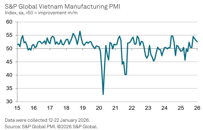 The Vietnam Manufacturing Purchasing Managers’ Index posted 52.5 in January, easing slightly from 53.0 in December but remaining well above the 50.0 threshold that separates expansion from contraction.
