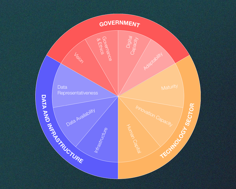 | The 2022 Government Artificial Intelligence Readiness Index is based on 39 indicators across 10 dimensions, which make up three pillars. Photo: Oxford Insights |