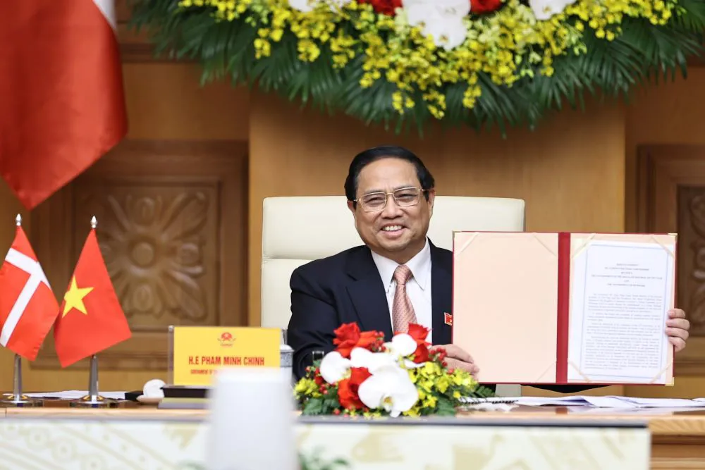 | Vietnam's Prime Minister Pham Minh Chinh and the signed Vietnam-Denmark Green Strategic Partnership agreement. Photo: VGP |