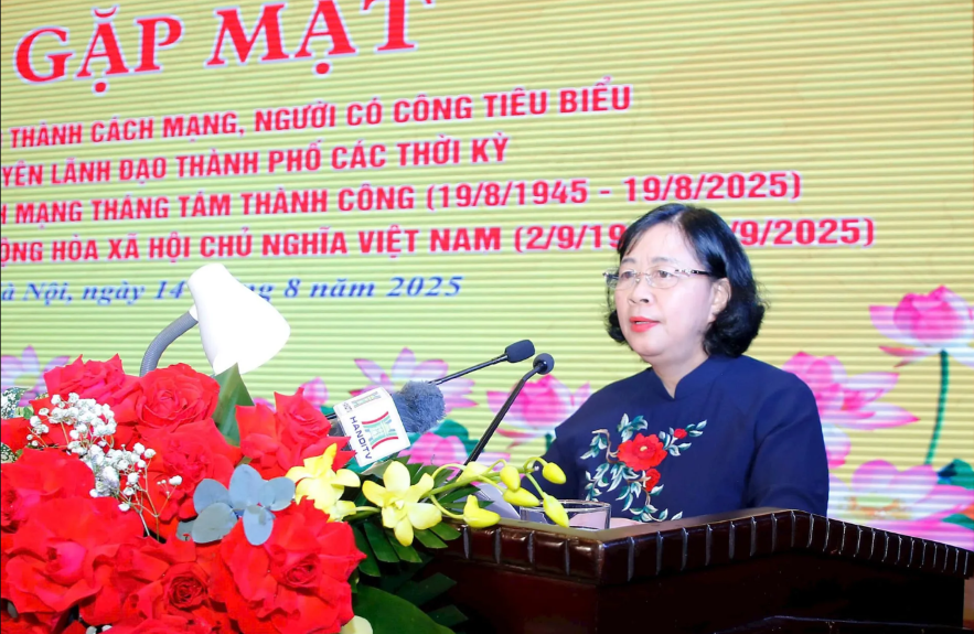 Secretary of the Hanoi Party Committee Bui Thi Minh Hoai speaks at a meeting with historical witnesses of August Revolution. Photo: Thanh Hai/The Hanoi Times