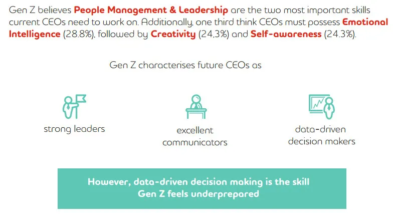 Looking forward to 2050, Gen Z-ers characterized future CEOs as strong leaders, excellent communicators, and data-driven decision makers. However, data-driven decision making is the skill that Gen Z feels underprepared. Additionally, more than one third think their current education should help them build up skillset in Negotiation, Agile project management, and Emotional Intelligence.