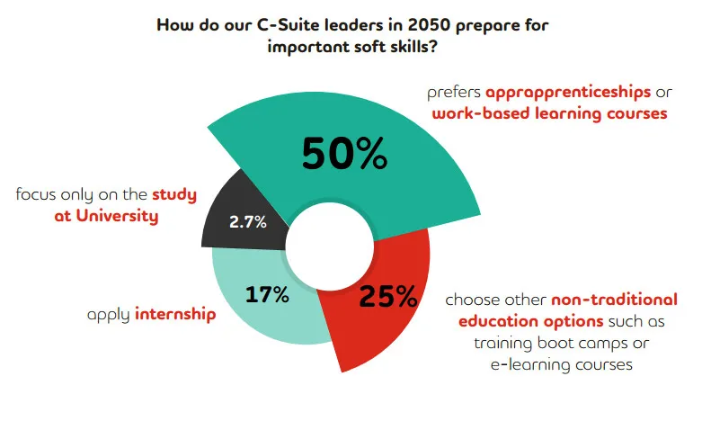 More than half of the future leaders prefer apprenticeships or work-based learning courses to master the above skills. Other non-traditional education options such as training boot camps or e-learning courses also gain popularity (25%). While acknowledging that a university degree is very important for a C-Suite leader in 2050, only 2.7% think focusing on the study at University is beneficial for their soft skills development.