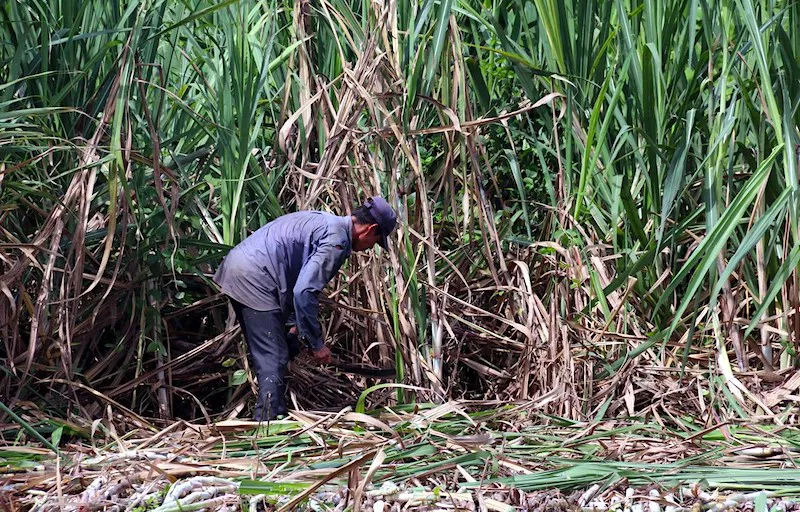 | A local farmer is harvesting sugarcane. Photo: VNA |