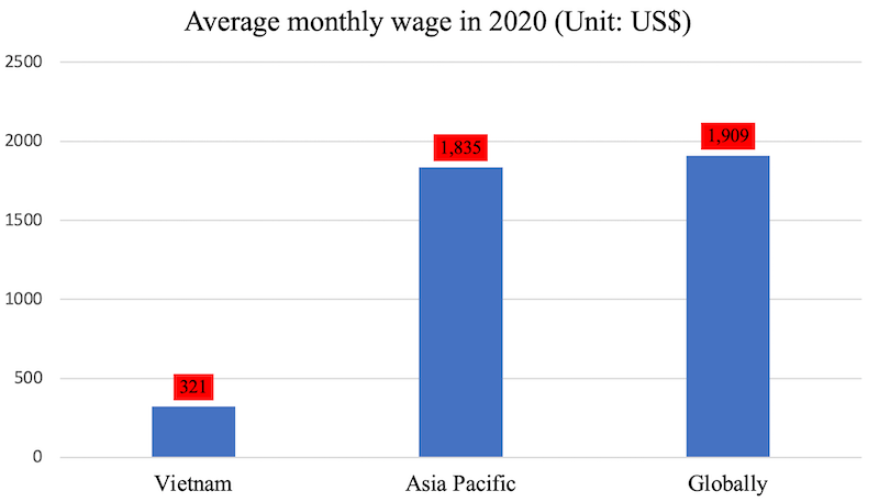 According to the report, Vietnamese workers’ average monthly wage was US$321 in 2020, up 32.6% compared to 2019, while the regional average in Asia Pacific was US$1,835 and $1,909 worldwide.