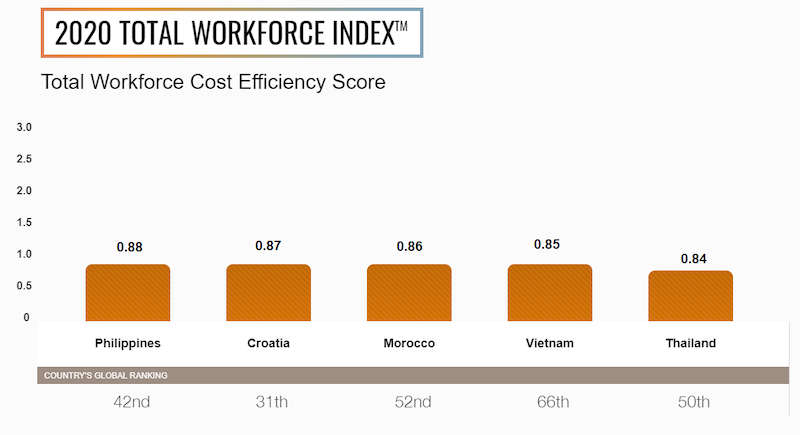 The TWI report identified Vietnam, the Philippines, Croatia, Morocco, and Thailand as the leading markets for cost efficiency thanks to labor cost and legal environment as the driving forces.