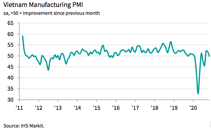 “Although at first glance the latest Vietnam Manufacturing PMI figures are a little disappointing, there is reason to believe the setback in November was just a blip on the road to recovery,” said Andrew Harker, associate director at IHS Markit, which compiles the survey.