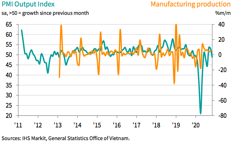 "We could therefore still be on track for a positive end to the year. In fact, business confidence improved to the highest since July 2019 on expectations that the Covid-19 pandemic will prove less disruptive in 2021. IHS Markit forecasts GDP in Vietnam to rise 6.1% next year."