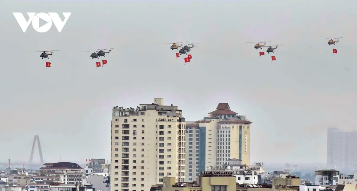 From military airports surrounding the city, helicopter squadrons soared high, proudly carrying the National Flag and the Party Flag against the clear autumn sky. Photo: VOV