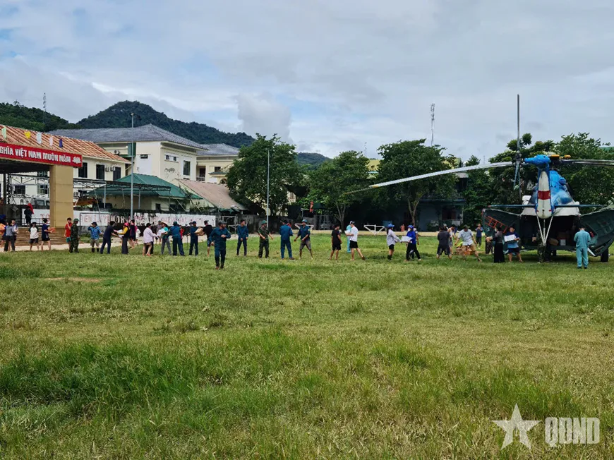 Emergency supplies being unloaded from a helicopter to the people of Tuong Duong Commune, western Nghe An Province. Photo: Quan Doi Nhan Dan Newspaper