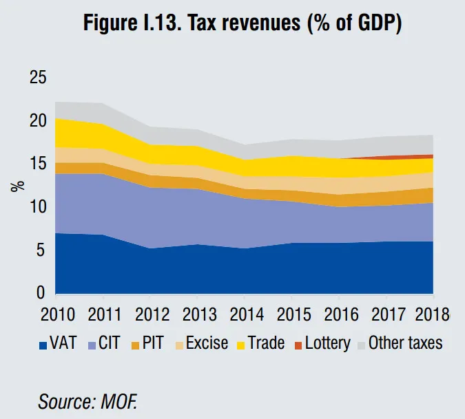 This decline has resulted from the combination of lower trade tax revenue, mostly customs duties (due to Vietnam’s international commitments), and declining revenue from the corporate income tax, as the government reduced the statutory rate with the aim of stimulating the economy.