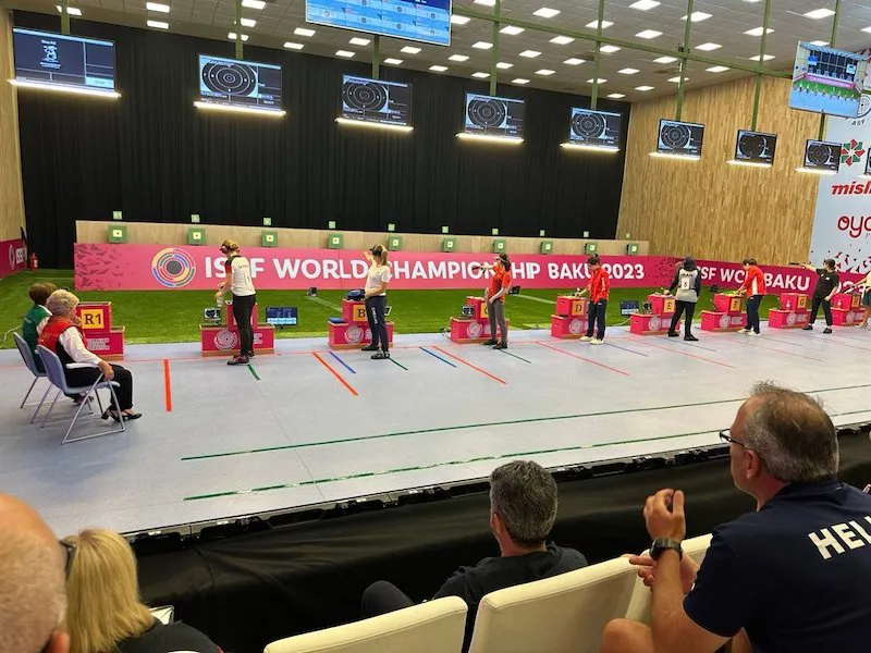 | Trinh Thu Vinh (third from left) at the 2023 ISSF World Championships taking place in Baku, Azerbaijan. Photo: Thanh Nien Newspaper |