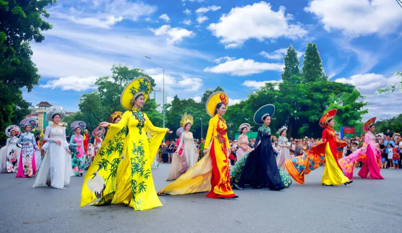 | Hanoi women in ao dai (traditional dress) during a parade. Photo: Pham Hung/The Hanoi Times |