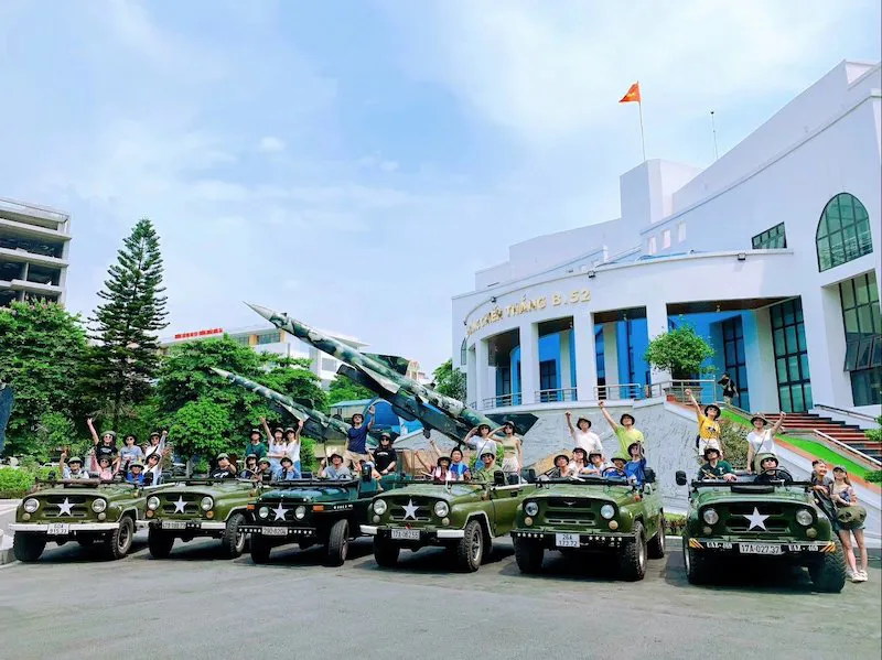 | Travelers in jeeps visit a local museum in Hanoi. Photo: Hanoi Backstreet Tours |