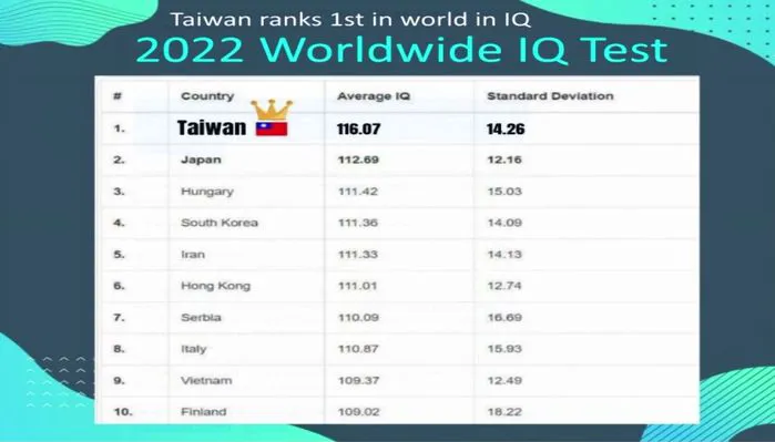 Among more than 100 countries and territories whose people participated in the IQ test, Taiwan ranked first with an average IQ score of 116.07, followed by Japan with 112.69.
