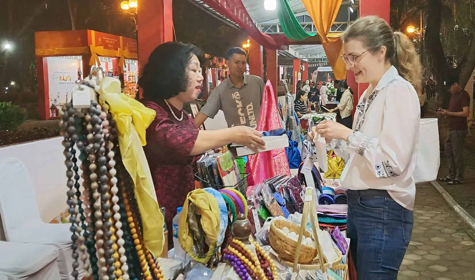 A foreign tourist buys souvenirs at the 2025 Hanoi Tourism Gifts Festival in April. Photo: Hoai Nam/The Hanoi Times