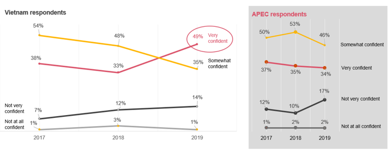 Moreover, business leaders in Vietnam are more optimistic about prospects for their own organizations, with 49% “very confident” of revenue growth in the year ahead, as compared to 34% of APEC business leaders.
