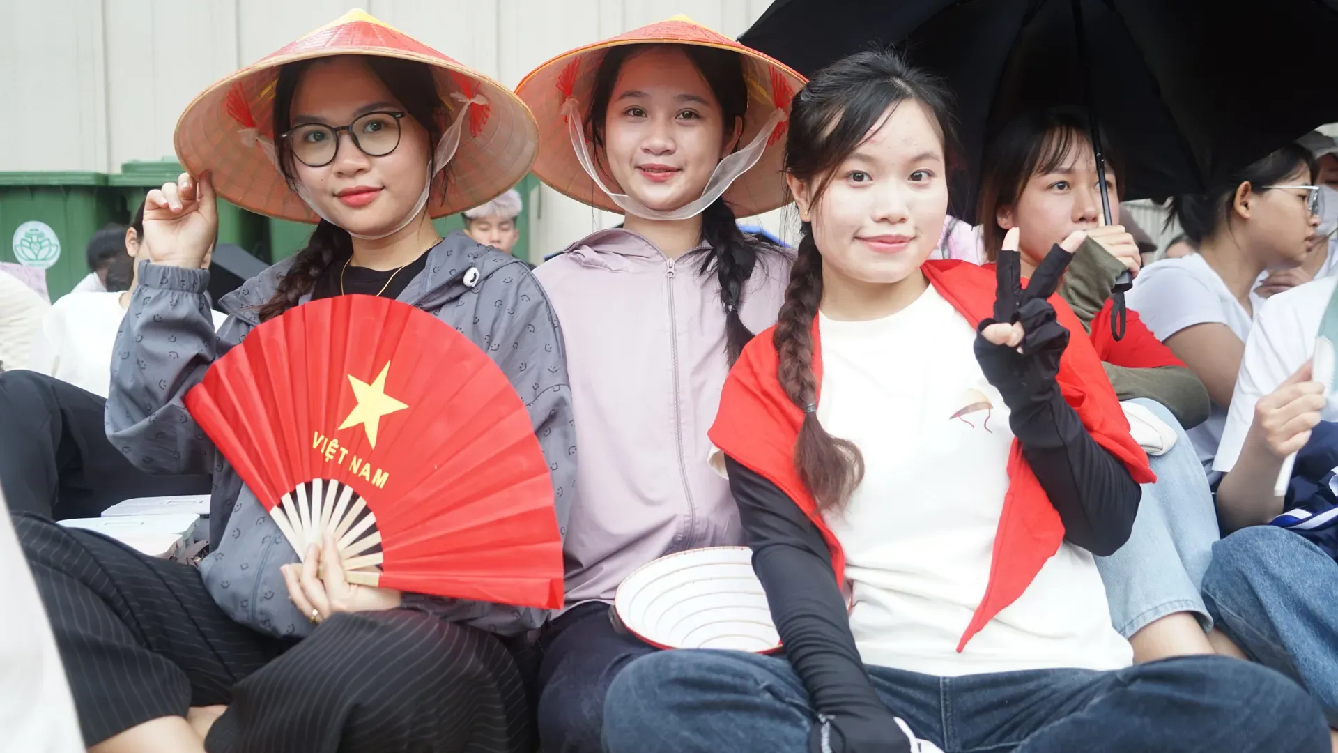 The four girls from Thanh Hoa Province with a sign saying "Proud to be Vietnamese". Excitement fills the air as people gather to celebrate this significant day in the nation's history. Photo: Cong Phuong/The Hanoi Times