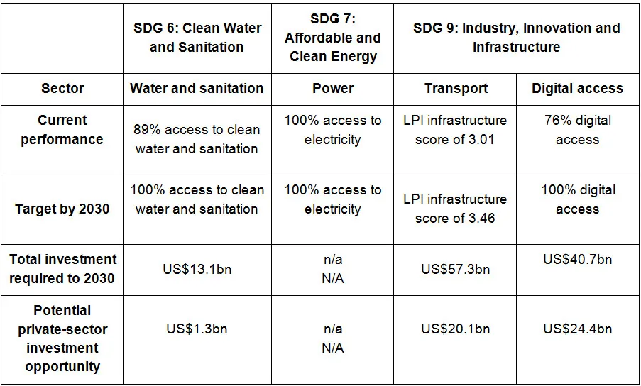 The study identifies opportunities for the private sector to contribute to three infrastructure-focused goals between now and 2030: SDG 6: Clean Water and Sanitation, SDG 7: Affordable and Clean Energy and SDG 9: Industry, Innovation and Infrastructure across emerging markets.