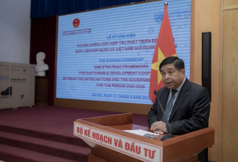 | Vietnam's Minister of Planning and Investment Nguyen Chi Dung speaks at the signing ceremony in Hanoi on August 11. Photos: UN |