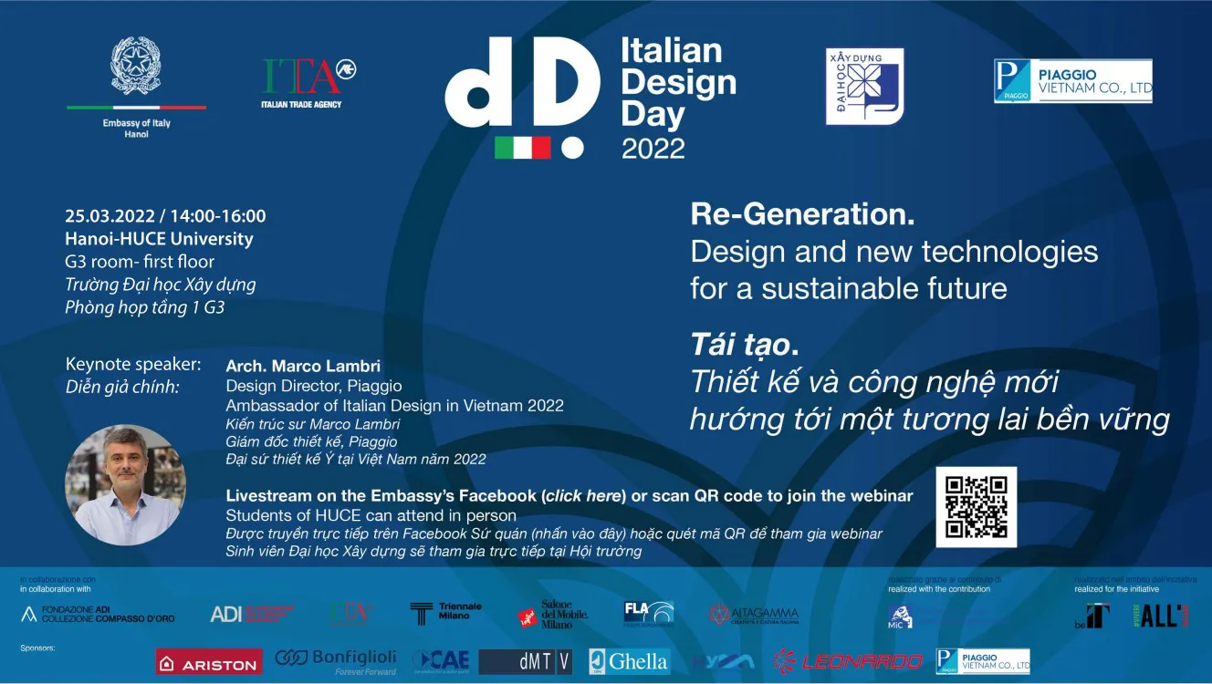 Vietnam joined the Italian Design Day in 2017. This year’s edition includes a hybrid conference held in NUCA with the attendance of Ambassador of Italy to Vietnam Antonio Alessandro; Italian Design Ambassador in Vietnam for 2022 Marco Lambri, Design Director of Piaggio; UNESCO Representative to Vietnam Christian Manhart; and Assoc. Prof. Dr. Pham Duy Hoa, NUCE rector.