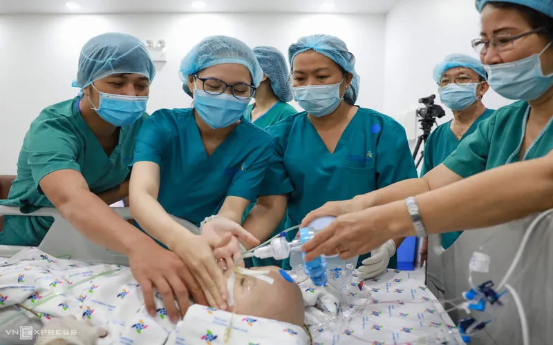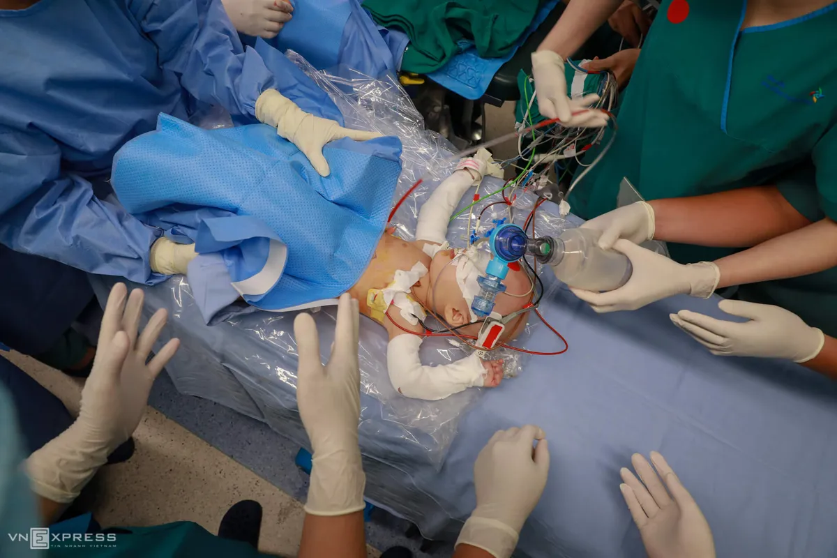 | The surgery started at 6:30am on July 15 at HCMC Children Hospital, and was expected to last for around 12 hours. Around 93 doctors, nurses and medical experts from several HCMC hospitals, including Tran Dong A, 79, a doctor renowned for successfully separating a pair of conjoined twins back in 1988, were on hand. Photo: VnExpress |