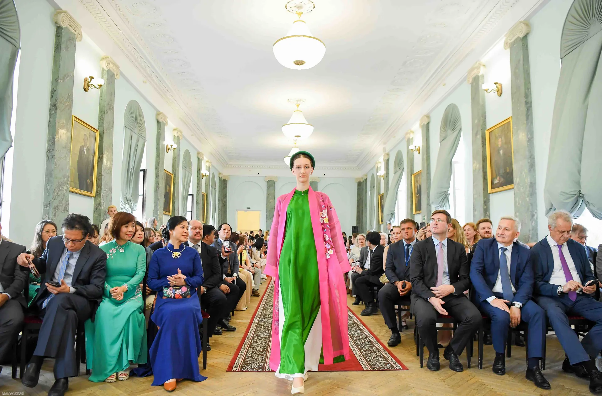 A performance showcasing traditional Vietnamese ao dai by students from Herzen University.