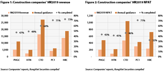Power Construction No.1 (PC1), a contractor in the electricity construction business, stands out as it completed 71% of its target revenue for 2019. In terms of net profit after tax (NPAT), Ricons Construction Investment(PHGC), Hung Thinh Incons (HTN), and Coteccons Construction (CTD), are similar, completing less than half of their annual NPAT estimates, while that of HBC is roughly one third, different to PC1 which completed 71% of its annual target.