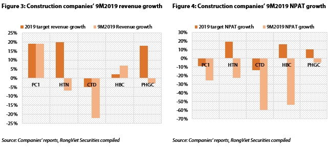 Compared to the same period last year it seems that most companies did not achieved the growth target for the January – September period, except for PC1 and HBC. As of the end of the first quarter in 2019, many contractors were optimistic on 2019 growth prospects. However, as nine months have passed, HBC was the only contractor which exceeded its annual growth rate target for revenue even though the exceeding amount is marginal (7% compared to the targeted 2%), while PC1 managed to match its expectations. HTN and PHGC, both of which are involved in large housing projects in urban areas, experienced negative year-on-year growth in the nine-month period, due to postponed progress at major projects. CTD seems to be the only one who had predicted the slowdown of the business but still saw a stronger reduction than expected (revenue down 22% in Jan-Sept versus a decline of 5% of whole year target).