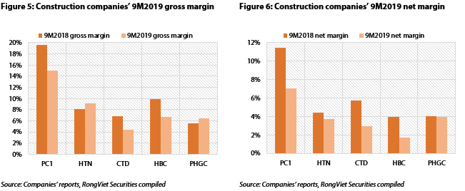 Gross margin results in the sector was uneven. Only HTN and PHGC managed to improve their gross margins. PC1, CTD and HBC’s were lower compared to the nine-month period in 2018. VDSC said it expected the larger players to face greater price competition while smaller companies stuck to their traditional clients, who offered low but sustainable margins. However, the bottom-line ratio tells the same story among all five companies, which is a slowdown in profitability. While CTD, PHGC and HTN seem to have a similar net margin of 3-4%, HBC’s net margin was heavily impacted by financial expenses, while PC1, again, took advantage of the electricity construction industry to keep a solid 7% net profit margin.