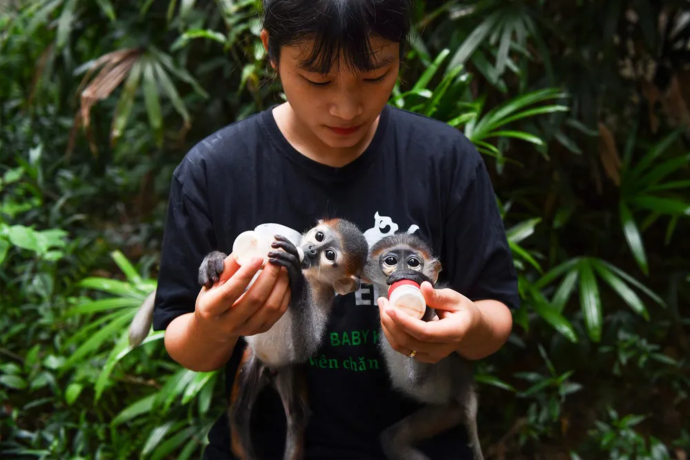 | Taking care of leaf monkeys at Endangered Primate Rescue Center (EPRC), Cuc Phuong National Park. Photo: Ngoc Thach |