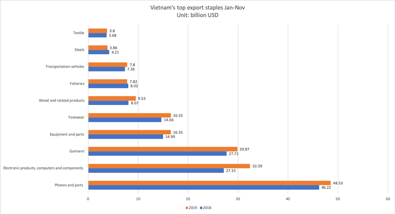 Vietnam posted a record high of US$10.94 billion in trade surplus in the first 11 months of 2019, higher than a surplus of US$9.01 billion recorded one month earlier, according to the General Department of Vietnam Customs (GDVC).