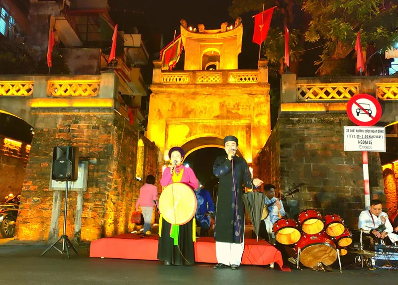 | A folk performance at Quan Chuong Gate in Hanoi's Old Quarter Area. Photo: Van Dung |