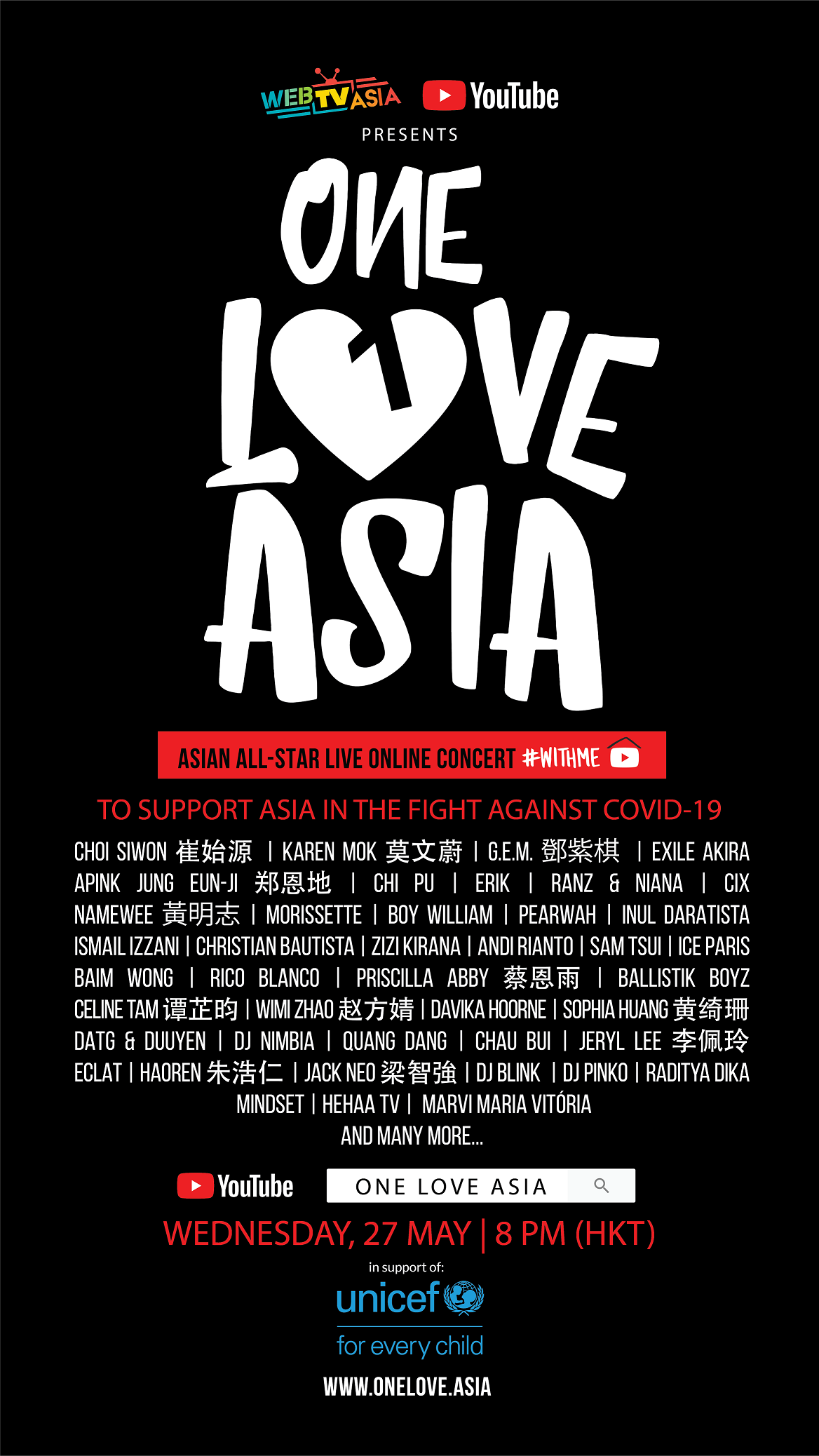 WebTVAsia and YouTube announced “ONE LOVE ASIA”, a star-studded concert in support of UNICEF, featuring a stellar lineup of celebrities, artists, public figures and YouTube creators across Asia, to be live streamed exclusively on One Love Asia's official YouTube channel on May 27, 2020.