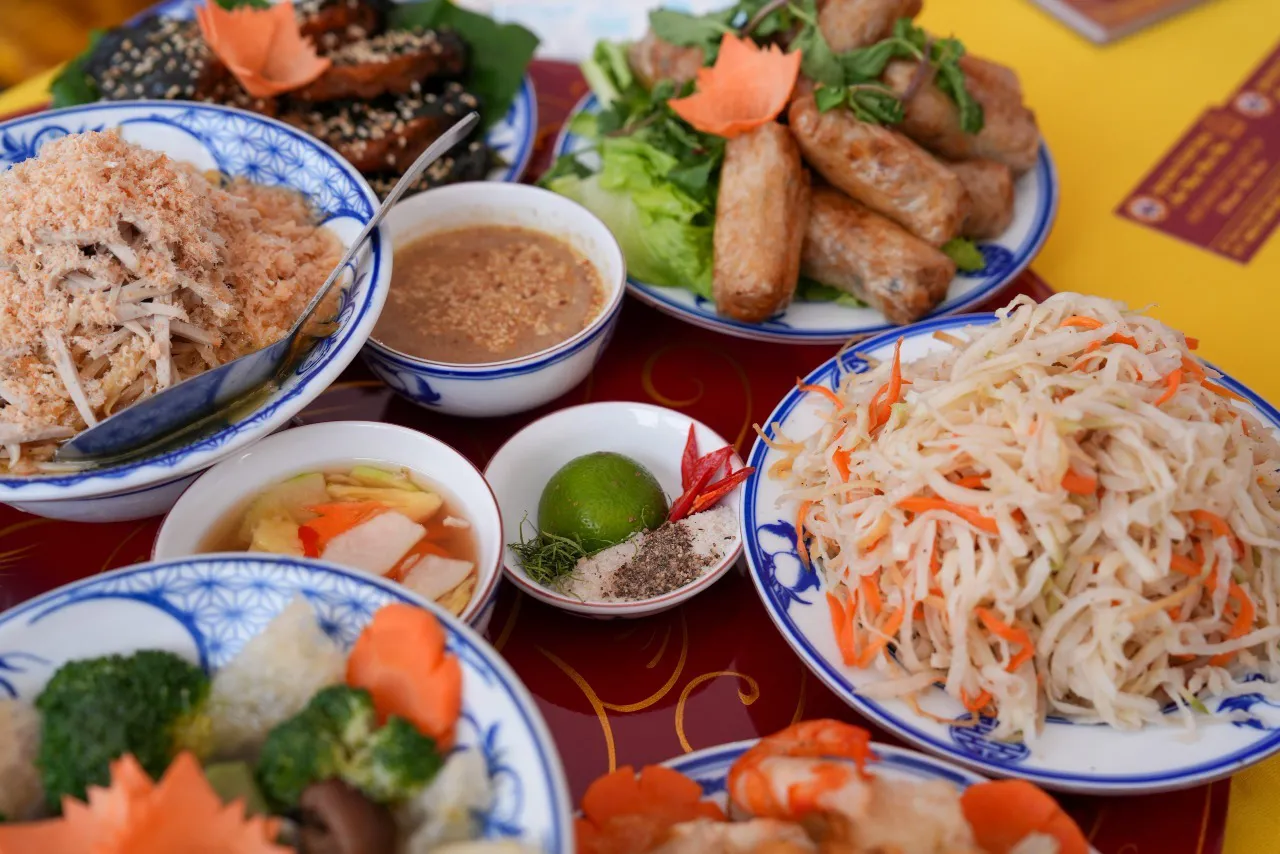 A traditional feast tray includes eight dishes and desserts, such as bamboo shoot and squid soup, kohlrabi stir-fried with squid, pork rind soup, glass fish soup, pigeon spring rolls, sticky rice and sweet soup, though many other local specialties could also merit recognition.