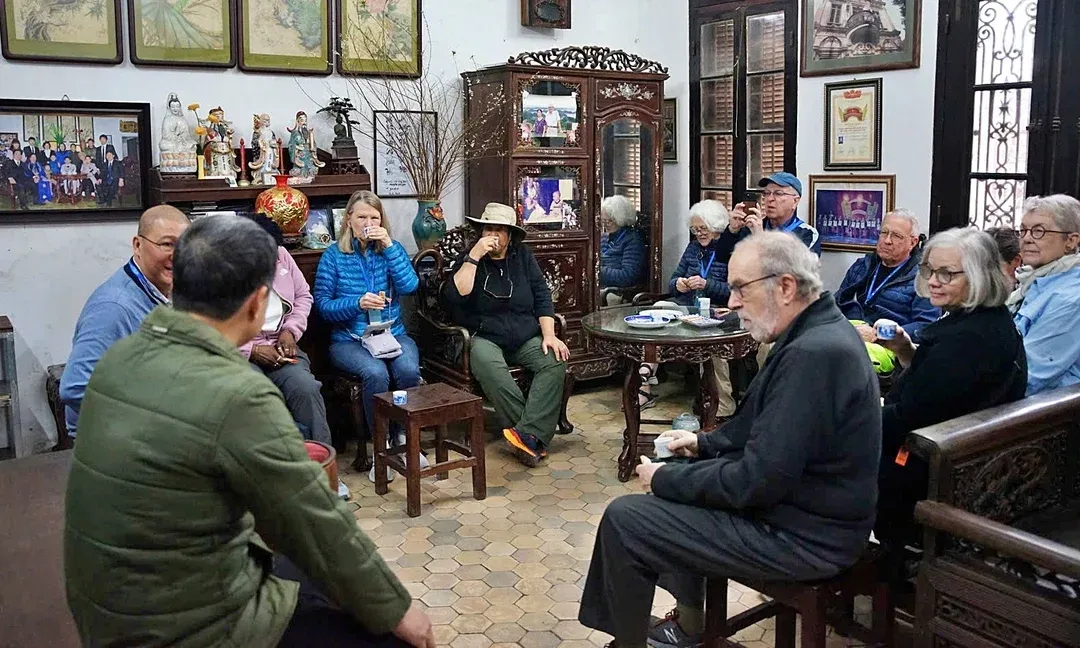International visitors participate in a traditional tea talk inside an old house in Bat Trang Village. Photo: Nong nghiepmoi truong