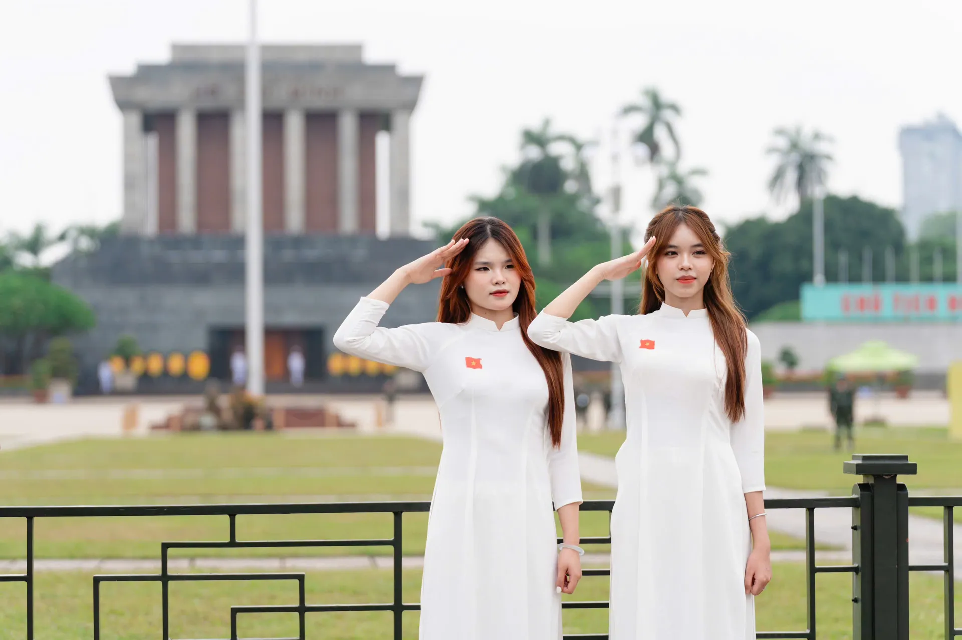 Tourists dressed in traditional ao dai take photos at Ba Dinh Square ahead of Vietnam’s National Day, which falls on September 2. Photo: Duy Khanh/ The Hanoi Times