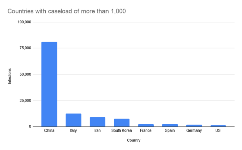 | Countries with more than 1,000 infections. Source: Johns Hopkins. Chart: Linh Pham |
