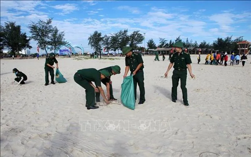 Soldiers and people in Quang Tri central province collect waste on the beach of Cua Viet. Photo: VNA |