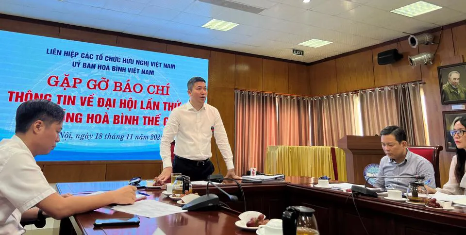 | Vice President and Secretary General of the Vietnam Union of Friendship Organizations (VUFO) Phan Anh Son speaks at the press conference to introduce the 22nd Assembly of the World Peace Council on November 18. Photo: Lien Ha/The Hanoi Times |