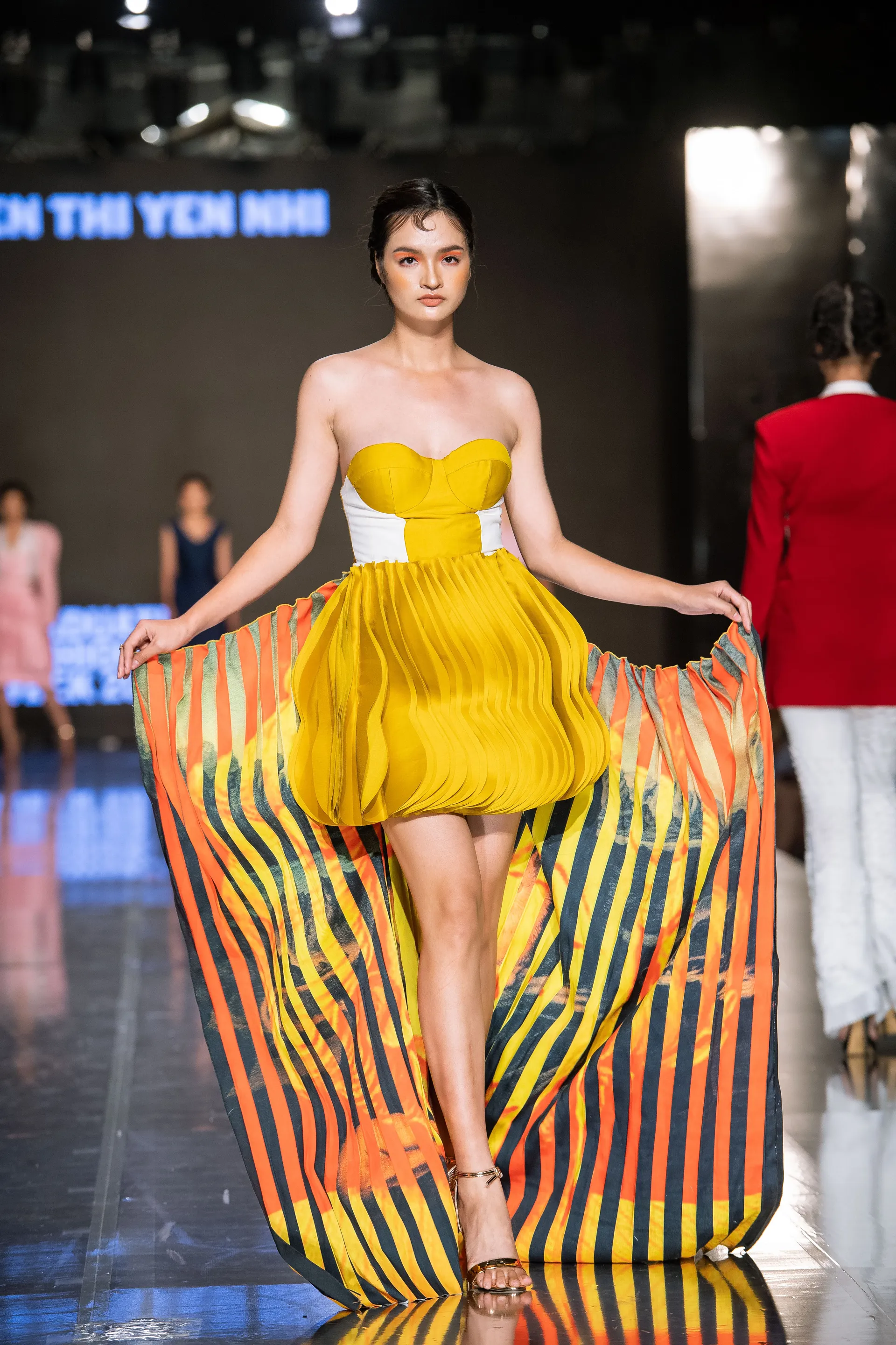 Behind the scenes, there are some trivia about the artistic creation process. Designer Phạm Trung Anh did not spend a dime on fabric because her collection Dear Lipesk, is made from more than 30 pairs of jeans provided by relatives, while designer Đào Thu Trang hand-stitched thousands of denim pieces together for her work Coup D’etat. Some outfits of Nguyễn Thanh Hiền’s Fly to The Sky weigh up to 10kg because they include metal parts and electric motors.