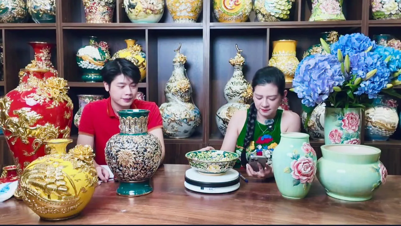 Bat Trang Ceramic Village artis Vu Nhu Quynh in a livestream shopping session. Photo courtesy of the artist