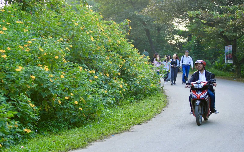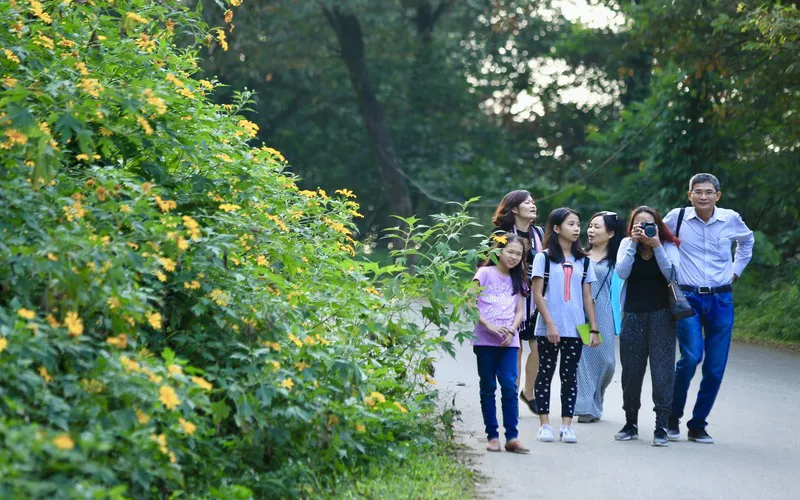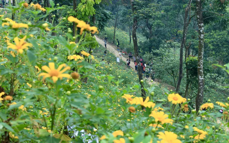Located 50 kilometers from the center of Hanoi, Ba Vi National Park is the capital's green lung, thanks to its spectacular scenery, green flora, cool climate, and rich biodiversity. Vast carpets of tithonia diversifolia highlight the landscape, making young people in Hanoi enthusiastic about the trip to enjoy the beauty of wildflowers.