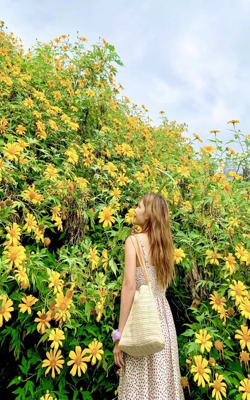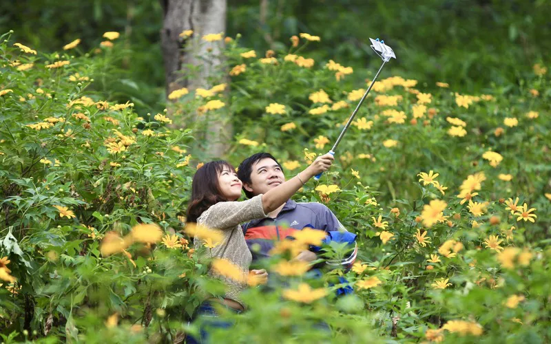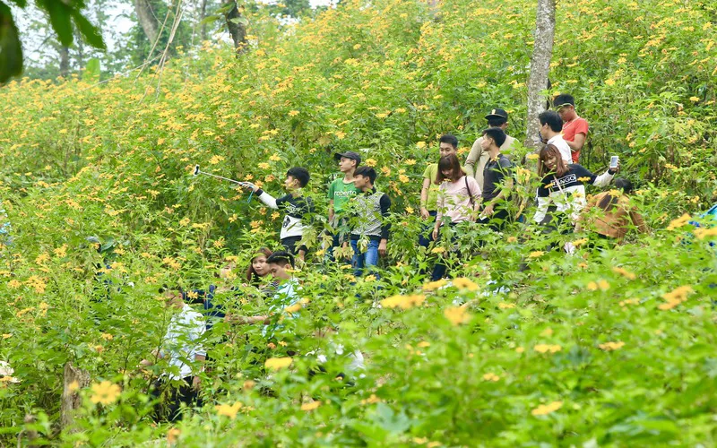Young people eagerly visit Ba Vi National Park in Hanoi these days to admire the dazzling beauty of tithonia diversifolia blooming at the end of the year and take photos with the bright yellow wildflowers on the mountainside.